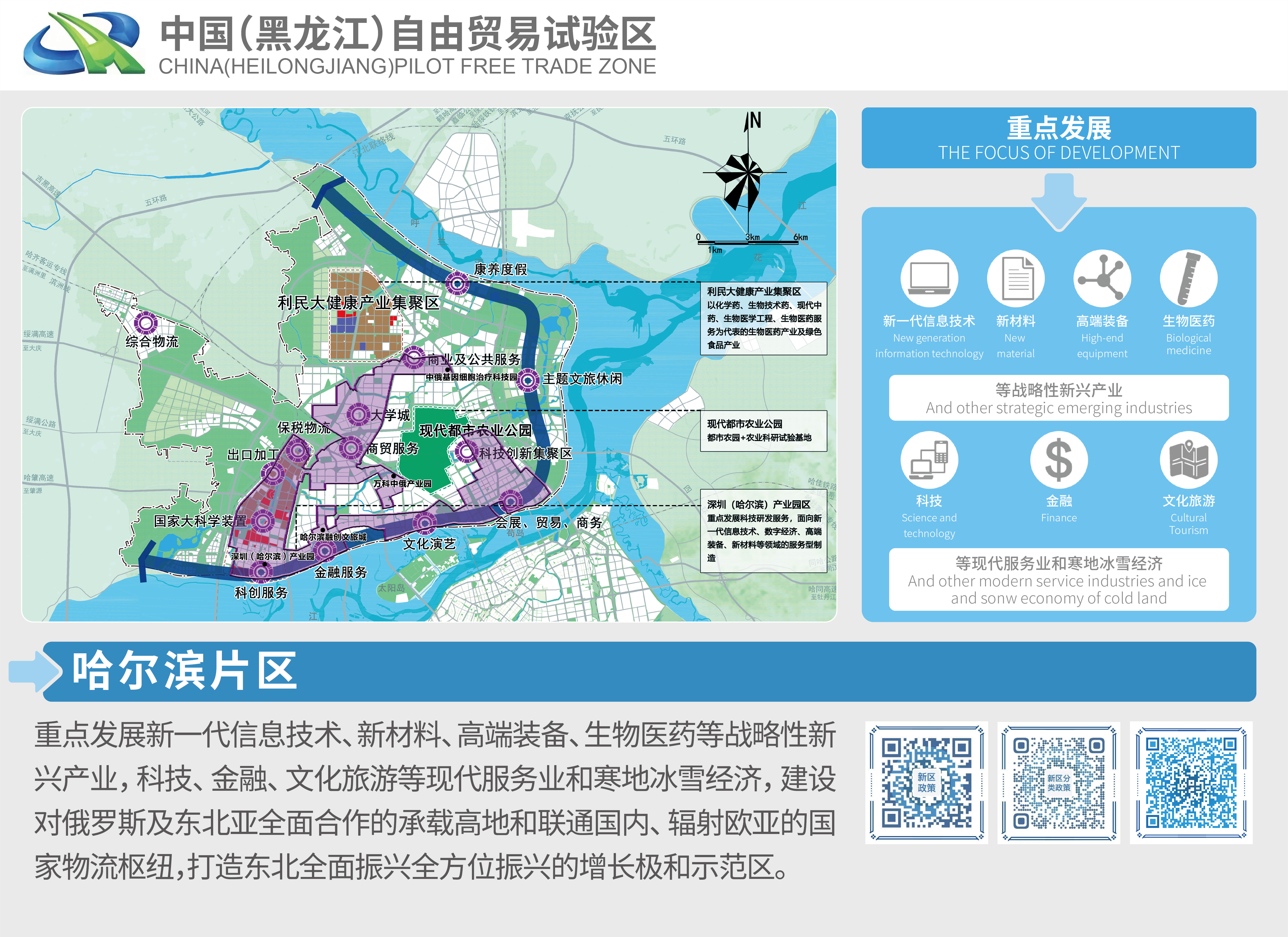 哈尔滨片区的功能定位是,重点发展新一代信息技术、新材料、高端装备、生物医药等战略性新兴产业,科技、金融、文化旅游等现代服务业和寒地冰雪经济,建设对俄罗斯及东北亚全面合作的承载高地和联通国内、辐射欧亚的国家物流枢纽,打造东北全面振兴全方位振兴的增长极和示范区。