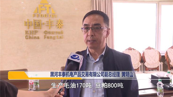 黑河丰泰机电产品交易有限公司副总经理 黄明山:项目投产以后,可以日处理大豆1000吨,生产毛油170吨、豆粕800吨,解决就业岗位300多个,我们生产出来的豆油豆粕,主要针对全国各地销售。